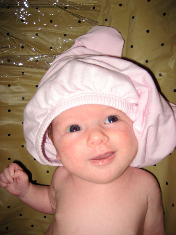 Here’s Annika’s first smile…ok, she’s still young, it may be gas, but I’m going to call it her first smile. She was getting changed and was a little upset but for some reason she thought it was really silly that her outfit was covering up her face. Luckily I was quick with the camera to capture this pic 🙂 Also earlier in the week, she rolled over for the first time. She actually has come close many times, as early as her first week at home, but it wasn’t until this week she was able to pull it off. I think she’s gotten strong because she seems to use all her muscles when she decides to cry…hehehe, just kidding.