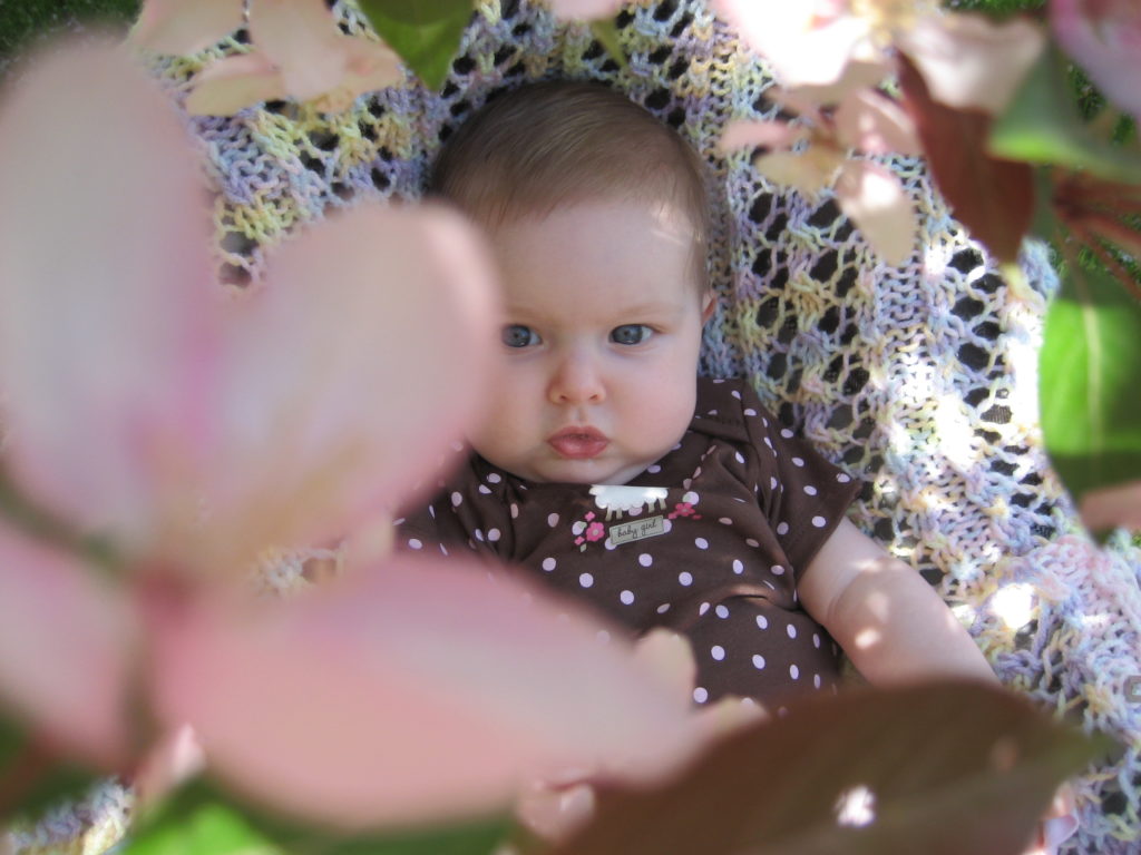 Been way too long since we’ve done an update. It’s really starting to hit me how much she’s grown. Looking at any of the pictures from her first days, she now looks like a monster. Now she’s starting to get a lot of personality. She likes to smile back, and giggle, and grab at daddy’s face. She also rolling all over the place. We were just up on vacation with Beth’s parents, and she would just roll back and forth all across the room. Most of all, she’s so curious with everything and just wants to be walked around to see everything…fun for her, tiring for dad. We use a little “snuggie” thing so that works the best. Here’s a picture of her when Beth took her for a walk a couple weeks ago.