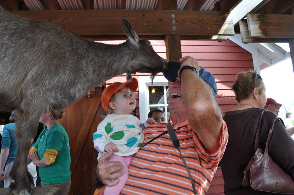 We went down to the Zoo with Grandpa and Auntie/Uncle and cousins.  It was one of the nicest days of the year so far, and we all had a good time at the Minnesota zoo.  I don’t know why we brought the stroller, because the only time she sat in it was for a nap.  This picture just cracks me up.  We went the the farm animals area, and this crazy goat just wouldn’t leave grandpa’s hat alone…both Annika and I thought it was hilarious